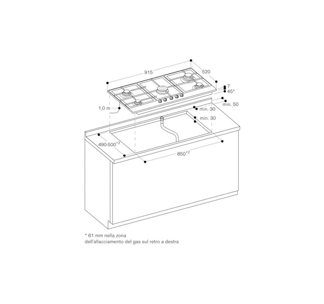 При встановленні декількох газових варильних Vario-панелей з сумарною потужністю вище 11 кВт необхідно передбачити мінімальну відстань до витяжки 70 см.
