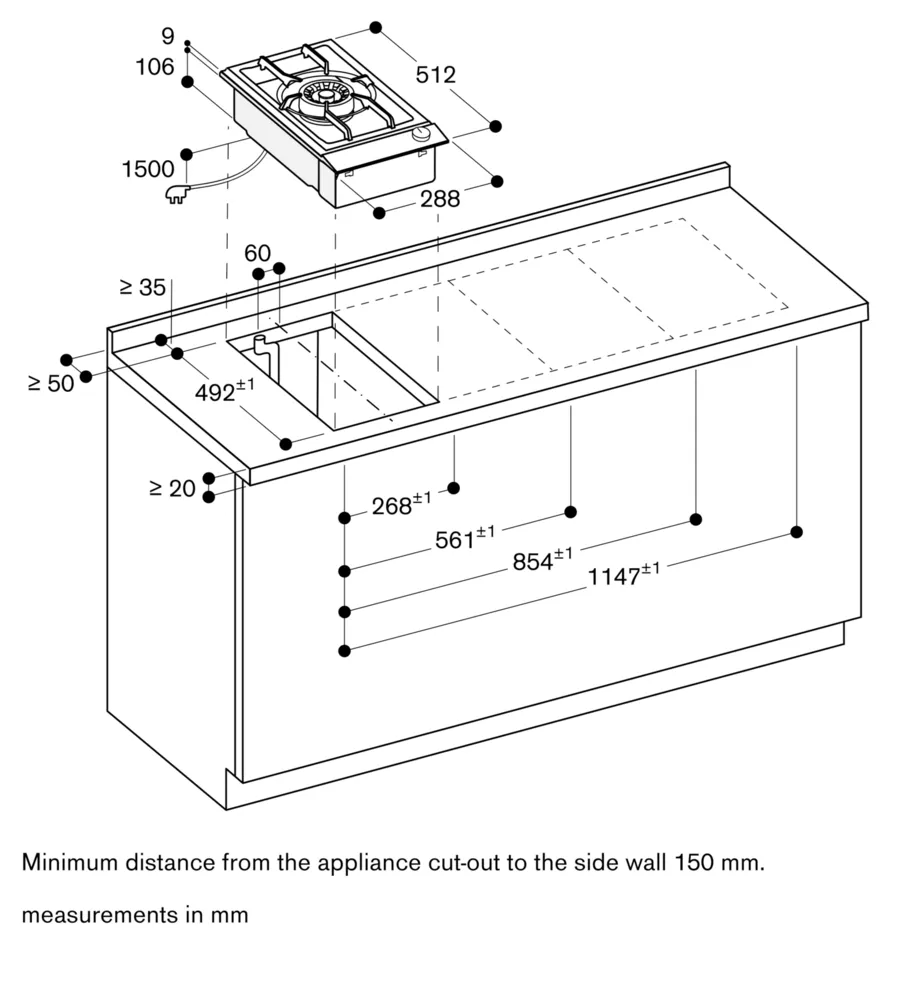При встановленні декількох газових варильних Vario-панелей з сумарною потужністю вище 11 кВт необхідно передбачити мінімальну відстань до витяжки 70 см.