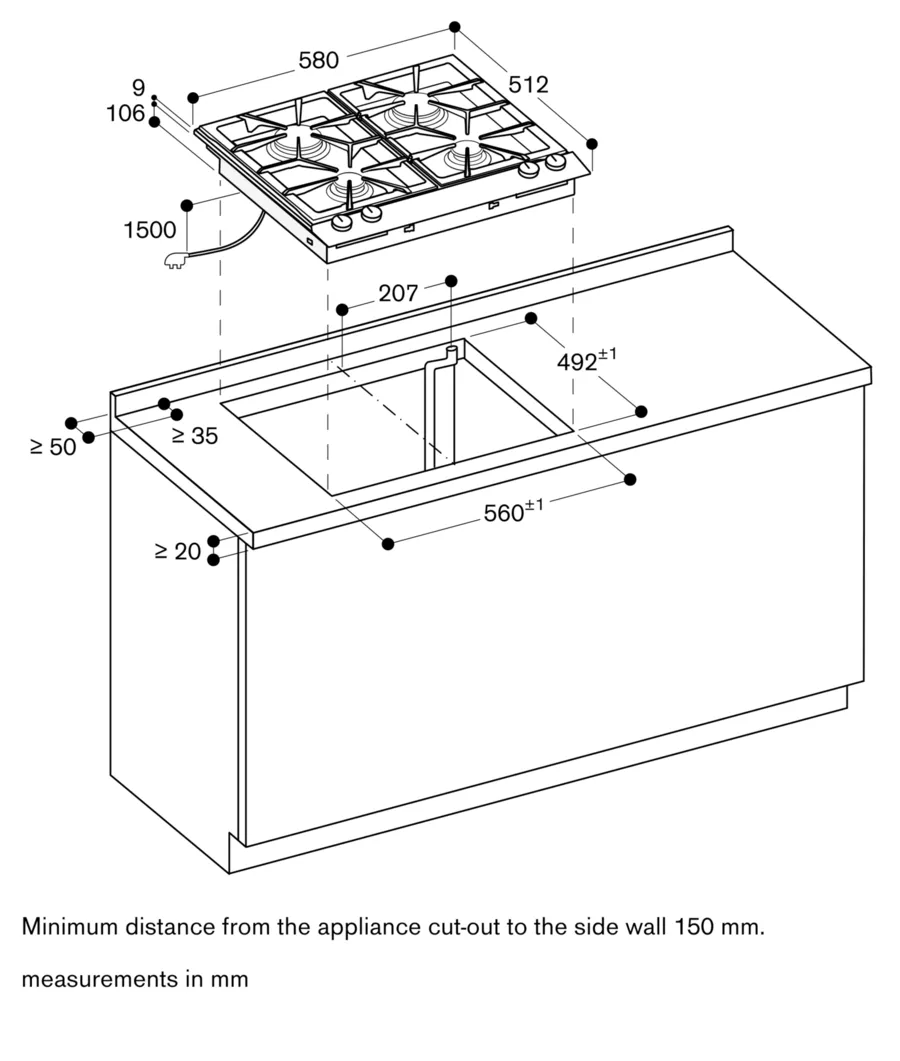 При встановленні декількох газових варильних Vario-панелей з сумарною потужністю вище 11 кВт необхідно передбачити мінімальну відстань до витяжки 70 см.