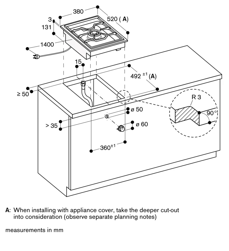 При встановленні декількох газових варильних Vario-панелей з сумарною потужністю вище 11 кВт необхідно передбачити мінімальну відстань до витяжки 70 см.