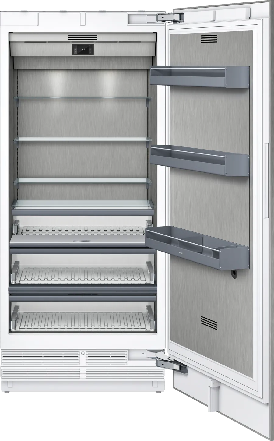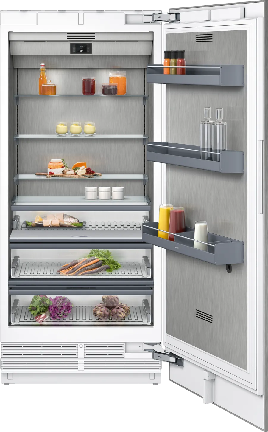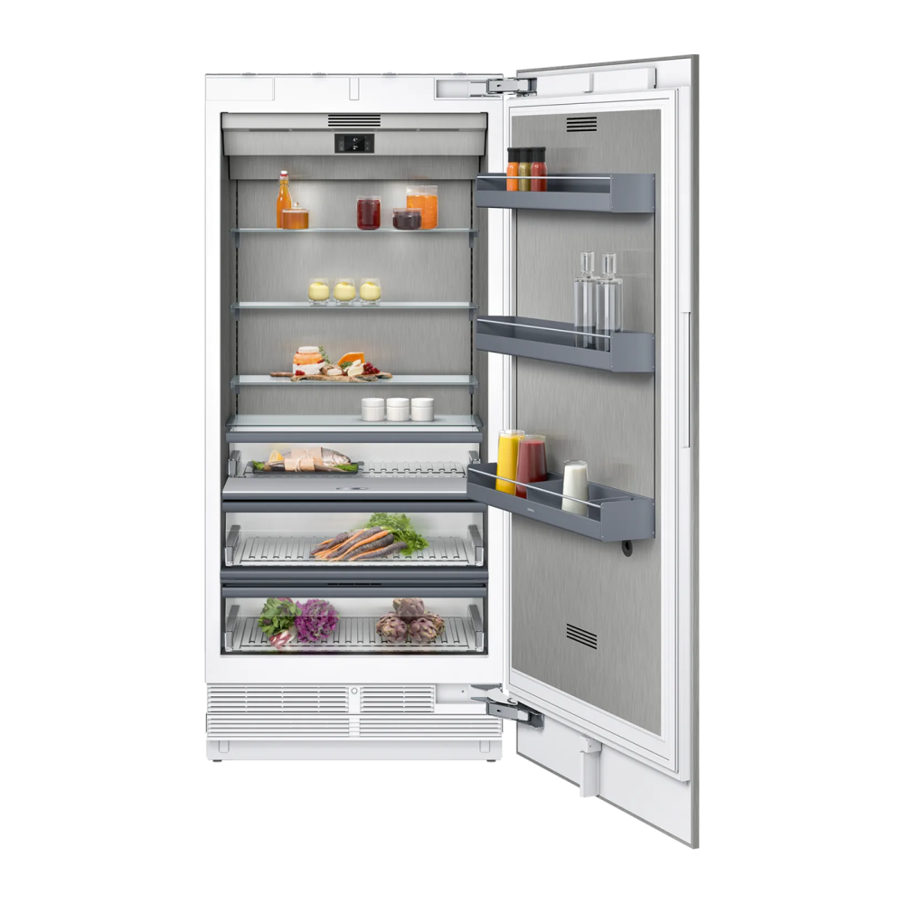 Ящики в моделях RC and RF розташовані на одній висоті. При установці side-by-side скляні полки і полки на двері можна встановити на одному рівні.