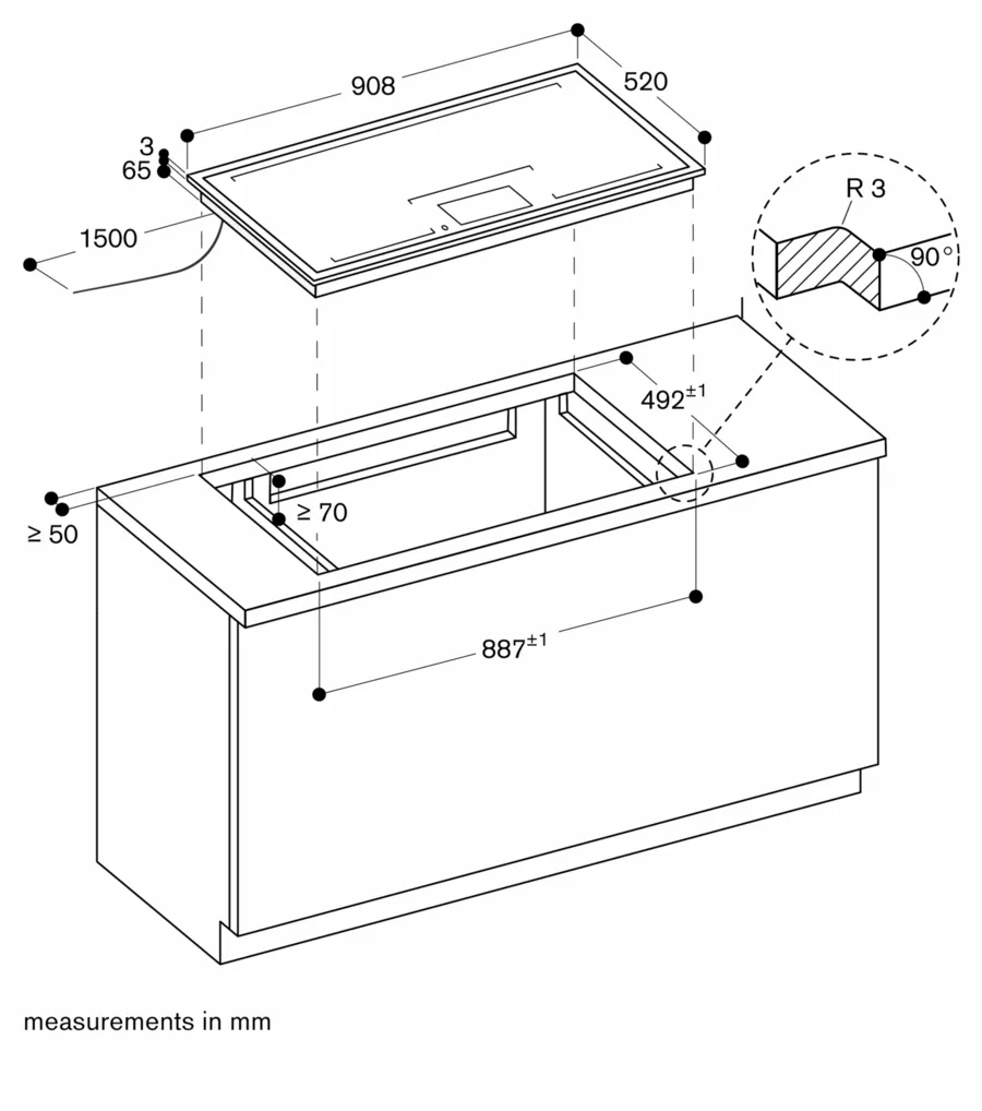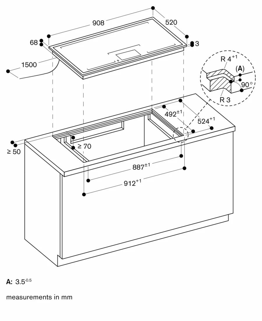 При плануванні вирізу необхідно враховувати тип монтажу (внакладку або на одному рівні зі стільницею). Кут вирізу в стільниці має дорівнювати 90 °.