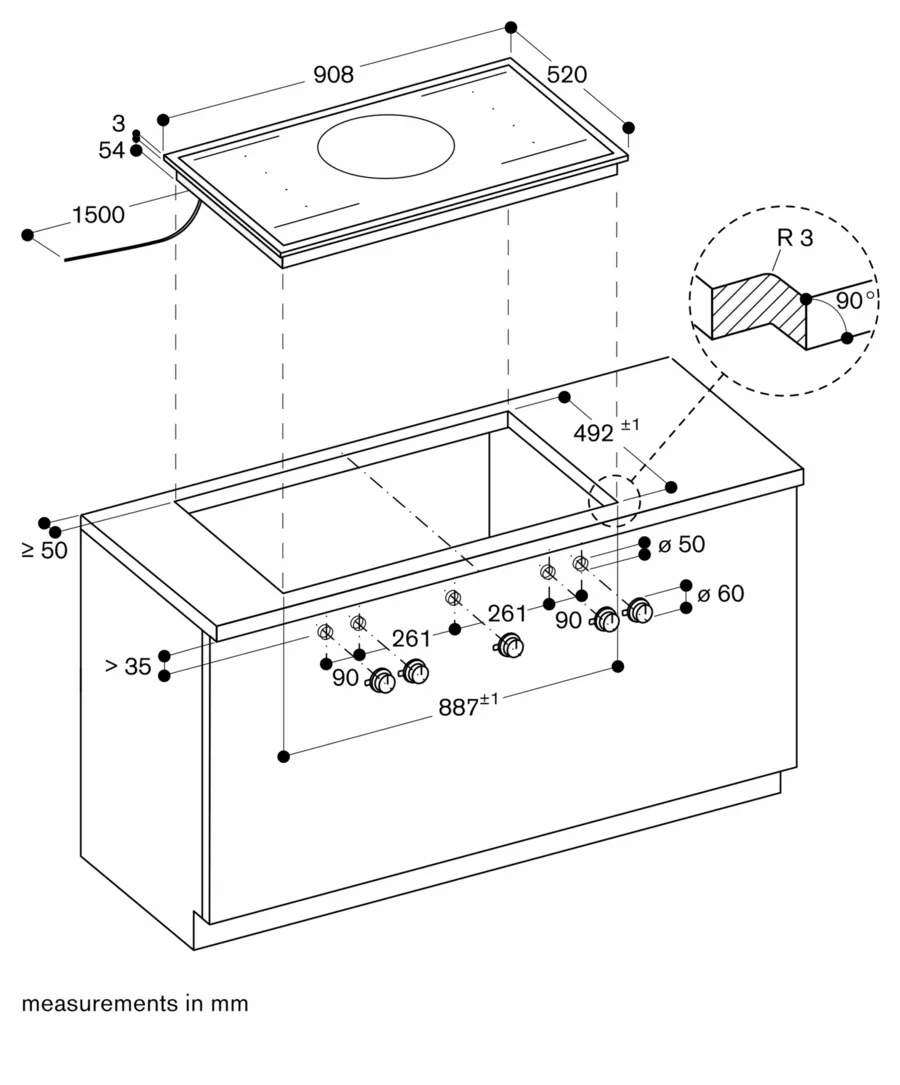 При плануванні вирізу необхідно враховувати тип монтажу (внакладку або на одному рівні зі стільницею). Кут вирізу в стільниці має дорівнювати 90 °.