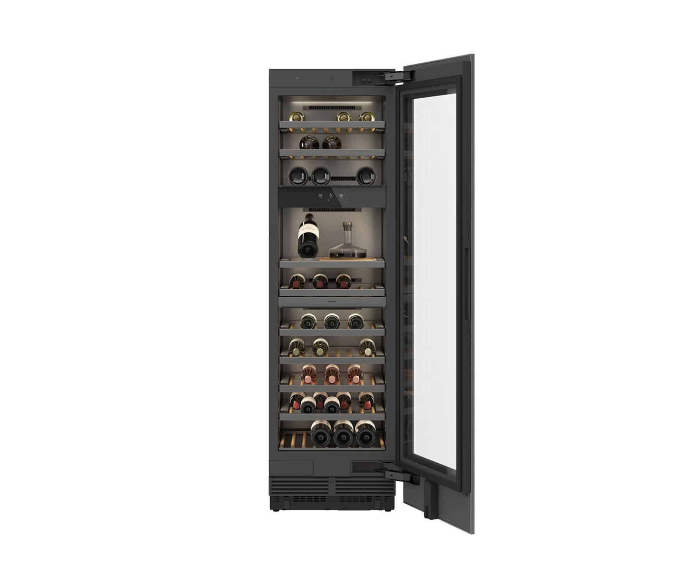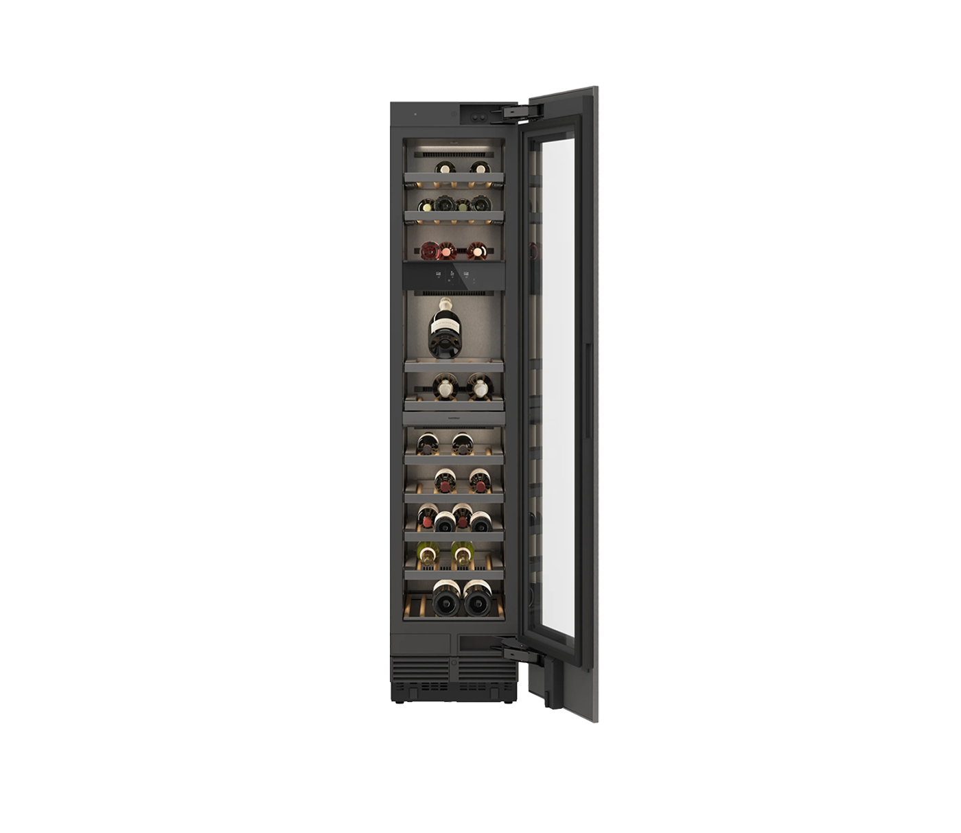 В этой серии представлены полностью интегрированные, встраиваемые модульные холодильники и морозильники, а также их комбинации, которые гармонично сочетаются со шкафами для вина, оснащенными системой климат-контроля. Благодаря концепции приборов cooling wall, сделанных из нержавеющей стали, поверхность которых практически не имеет швов, вы можете сделать интерьер своей кухни весьма оригинальным. После отодвигания массивной двери вашему взору откроется внутреннее пространство приборов, в котором высококачественная нержавеющая сталь гармонично сочетается с антрацитовыми анодированными деталями из алюминия и прозрачными стеклянными полками. Освещение пространства обеспечивается теплыми белыми безбликовыми светодиодами, подчеркивающими минимализм дизайна.