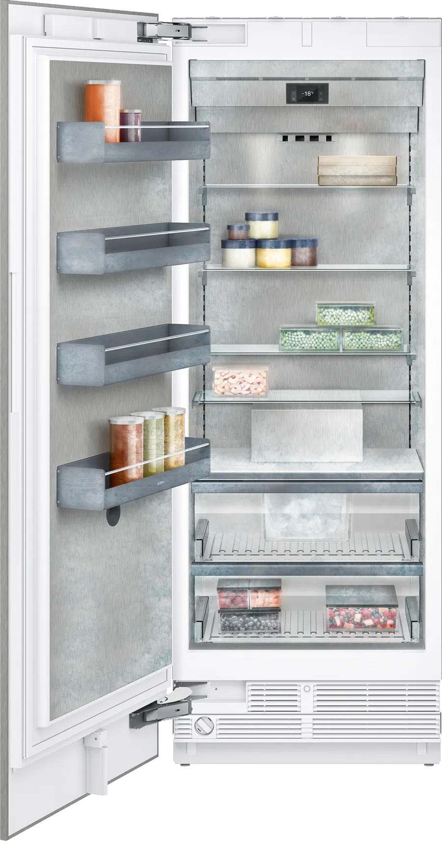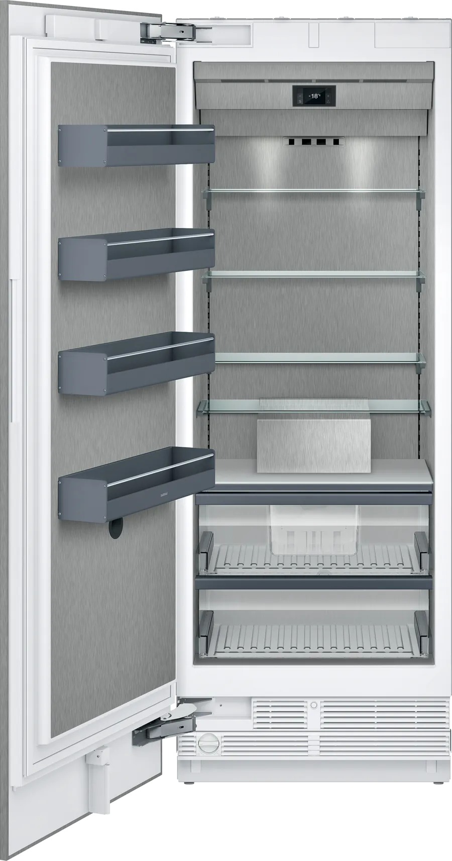 Матеріали та внутрішній дизайн відповідають моделям RC: - Скляні полки - Полиці на двері з анодованого алюмінію в кольорі "темний антрацит".