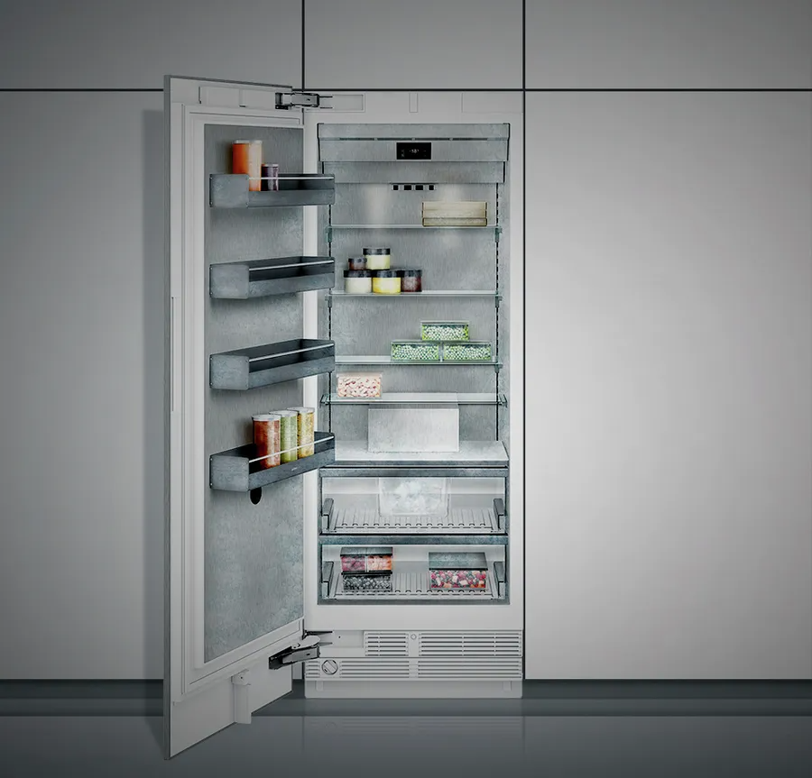 Ящики в моделях RC and RF розташовані на одній висоті. При установці side-by-side скляні полки і полки на двері можна встановити на одному рівні.
