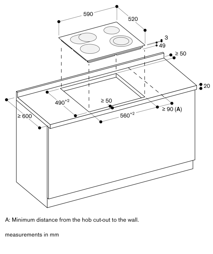 Рекомендована товщина стільниці для монтажу варильної поверхні: 20 - 50 мм.