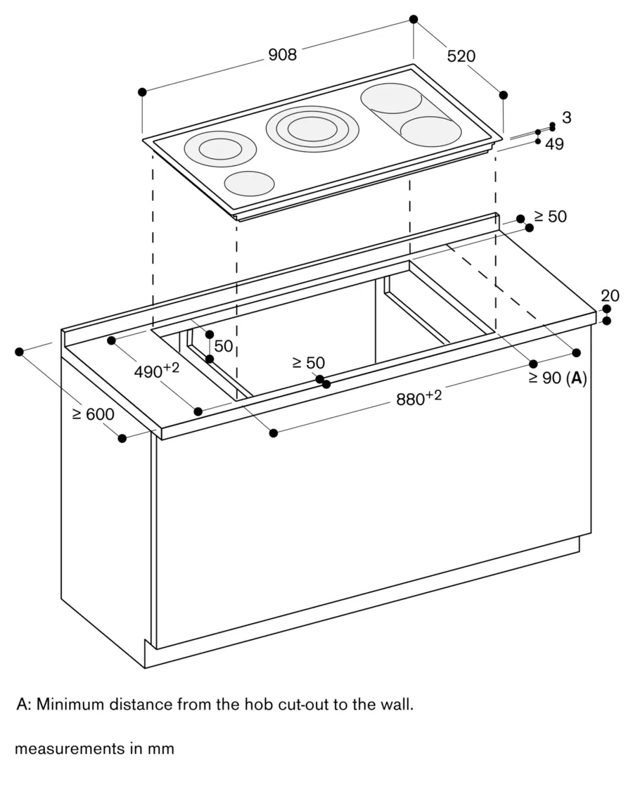 Рекомендована товщина стільниці для монтажу варильної поверхні: 20 - 50 мм.
