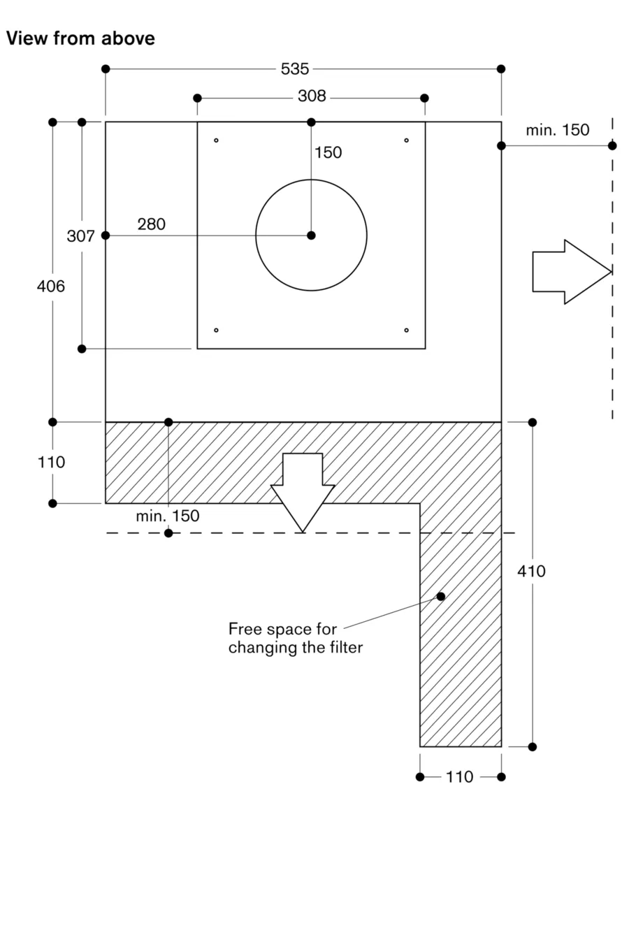 Для зміни фільтрів потрібна можливість зняття ніші. Рекомендована мінімальна відстань між отвором для фільтрів та стінкою підвісної шафи (якщо немає вентиляційної решітки безпосередньо навпроти): 15 см