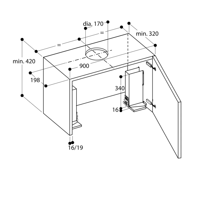 Для того, чтобы поменять активный угольный фильтр, нужно полностью открыть дверцу подвесного шкафа.